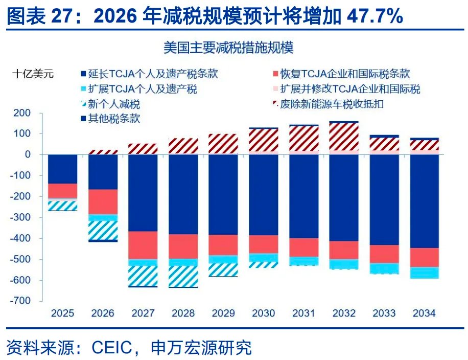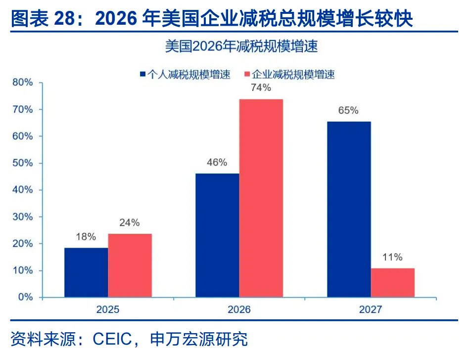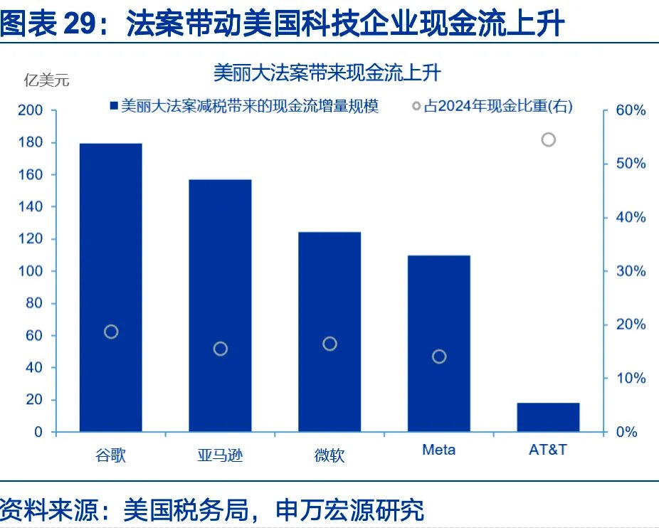 美国财政的特征是高度重视减税,通过税收激励提振消费与投资,扶持战略产业。2026年美国总体减税规模3960亿美元,相比2025年的2682亿上升47.7%。其中,个人层面减税规模2750亿;企业层面减税规模1210亿,企业层面的主要增量措施包括:1)提高半导体制造投资税收抵免,2025年12月31日之后投入使用的设备,抵免比例从25%提升到35%,须在2026年底前开工。2)加速折旧。2025年1月19日之后,企业购买设备、机器、建厂,可在当年一次性全额扣除,是对企业资本开支的直接刺激。3)研发支出费用化。2025年1月1日起,允许企业全额抵扣研发费用,可改善研发密集型企业(半导体、软件、AI等)的税后现金流。谷歌2025年通过法案获得179亿美元现金,占2024年现金规模的18.7%,亚马逊则为156.7亿美元,占比16%。