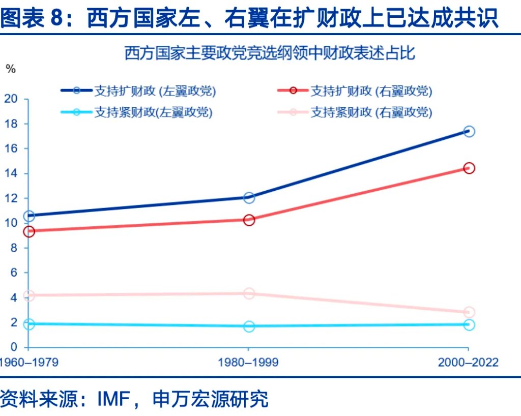 财政政策正常化的两大约束力量在减弱,一方面是主动紧财政的动力减弱。驱动财政收缩的力量可划归为两类,一是主动正常化,包括增税,减支等;二是被动正常化,如政治僵局,债务风险倒逼财政整顿。在2025年的时间点,货币政策在法律和技术官僚的主导下尚且具备主动正常化的能力,然而海外政党主动进行债务整顿的动力已在持续减弱。海外政党纲领中,支持财政扩张的内容占比已从70年代的10%上升至2020年的20%。2010年代后,发达经济体左、右翼政党均更倾向于扩财政,财政收缩更难从内部产生。
