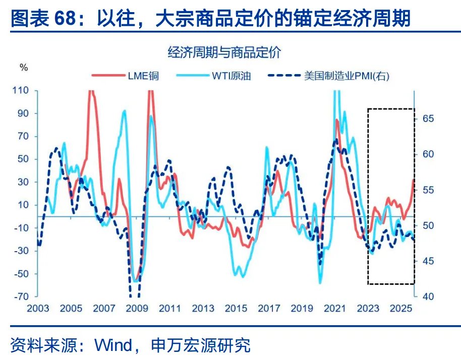 第五,供给端驱动的逻辑强化,或导致部分商品价格上涨具有更强的持续性。财政逻辑的转变,已在实质改写大宗商品的定价逻辑。其一,以工业金属为代表的部分大宗商品开始脱离经济周期,具有独立的产业逻辑支撑。以往,大宗商品定价锚定全球制造业周期,但2022年美国推出《通胀削减法案》以来,新能源、电气化、电网建设需求上升,以工业金属为代表的商品价格脱离周期,出现趋势上升,原油等传统能源需求降低,价格持续低迷。其二、实物货币逻辑扩散。美国债务扩张、霸权滥用以美元信用为代价,作为主权信用的对冲工具,黄金受到直接提振。2025年以来,实物货币属性向外扩散,铜、锑、镓等实物资产也被赋予更强的金融属性。其三、储备溢价上升。关税风险、地缘不确定环境下,关键物资供应中断风险上涨,战略物资储备的刚性需求上升。财政支持的领域,集中在电力基建、军工、半导体等工业链条上、利率敏感型链条难以得到修复,与战略储备需求低相关的油气、铁矿、农产品等或缺少中长期产业逻辑,财政引发的价格上行或更加分化。