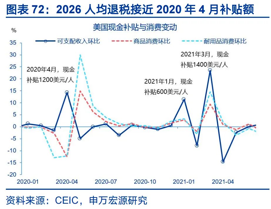 具体到财政的拉动方式上,美欧日财政的作用方式各不相同,美国财政拉动表现为减税脉冲。美国2026年二季度或形成一轮减税脉冲,下半年或因中期选举加码。《美丽大法案》减税措施或在2026二季度(2月开始退税,4月前后为高峰)集中落地,形成一轮退税潮,退税总额或增加30%达到4120亿美元,人均退税规模或增加700至1000美元至3743美元。退税包括:1)标准扣除额增加;2)小费、加班费及汽车贷款利息扣除;3)儿童税收抵免增加;4)州和地方税扣除(SALT)从1万美元提高到4万美元;4)老年人额外扣除。2026年退税规模与2008年960亿现金支票补贴规模较为接近,2008年的补贴拉动当年二季度消费增速1.8个点,GDP增速1.3个点,拉动三季度消费0.8个点、GDP增速0.6个点。本轮减税或可提振2026年上半年增速。