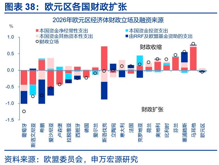 主要经济体扩财政的法律障碍已基本清除。日本与德国已通过2026年预算,欧元区已发布2026年财政立场声明,美国虽未通过2026年预算,但减税已可实施。美国财政年度为每年10月1日至次年9月30日,多数年份美国难以按时通过财政预算,仅能借助临时拨款过渡,财政拨付节奏更保守,但减税措施由于已完成立法,可较早落地。日本财政年度为4月1日至次年3月31日,往往通过补充预算在年中增加支出。高市上台后,日本在2025年11月21日公布21.3万亿日元经济刺激计划,2026年1月开始落地执行。欧元区没有统一财政预算,欧元集团与欧盟委员会每年对成员国总体财政立场的发布声明。德国财年为自然年,2026 德国联邦预算已于2025 年12月19日由联邦参议院批准,财政法律授权已到位。