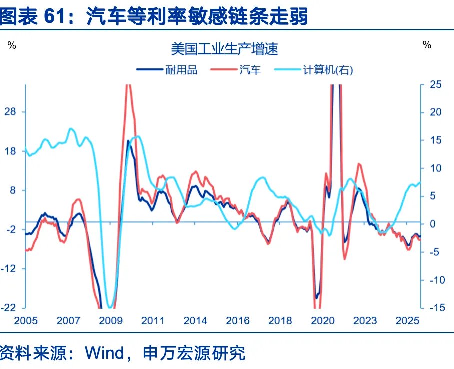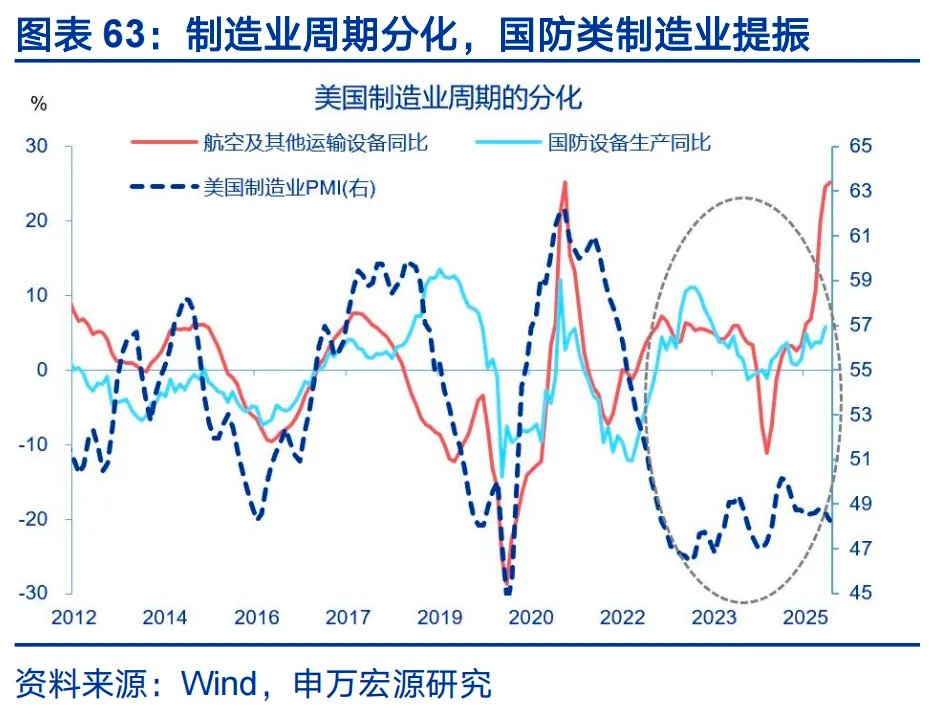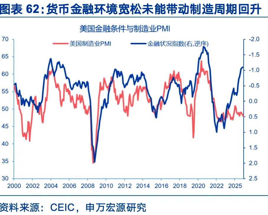 第三,产业链修复的逻辑不再相同。本轮全球财政扩张更遵循安全优先的逻辑,国防、安全、供给约束的产业链条可能成为拉动经济的核心,地产、耐用品等传统利率敏感链条或难以全面提振。一方面,传统私人部门依然面临利率传导梗阻,美国地产陷入利率锁定效应中。美国地产市场以固定利率贷款为主,当市场利率上升,存量房主手中的旧利率往往低于市场水平,一旦卖房就需放弃低利率,导致地产交易被“锁住”。参考FHFA的估算,市场贷款利率每比存量贷款利率高1个百分点,出售概率下降18.1%,疫情后美国地产销售比无锁定效应的情形低57%。地产持续低迷,住房链条对制造业的拉动减弱。另一方面,地缘与经济政策不确定性阻碍私人制造业扩张。2022年之后金融环境与制造业周期分叉,金融条件虽宽松,但制造业周期仍低迷。但公共部门支持的国防、半导体等链条异军突起,如美国航空设备生产增速2025年以来已大幅抬升。财政主导的特征可能导致美国经济继续两级分化,局部繁荣可能难以带动全球制造业周期的全面修复。