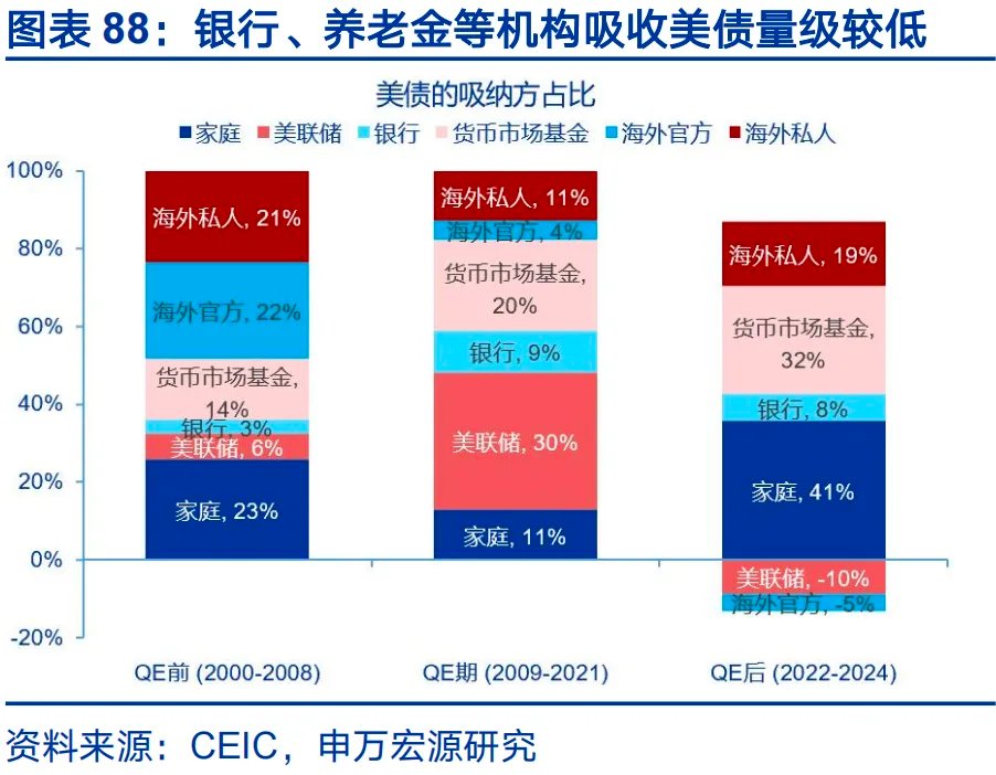 其二,对内方面,扩大国内私人部门购债需求。包括:1)扩大国内机构购债需求,包括养老金、保险、货币基金等;进一步放松SLR,扩大银行购债能力;2)财政-央行协同,避免央行退出QE时造成期限溢价抬升,高赤字环境下,短期内缩表概率较低。