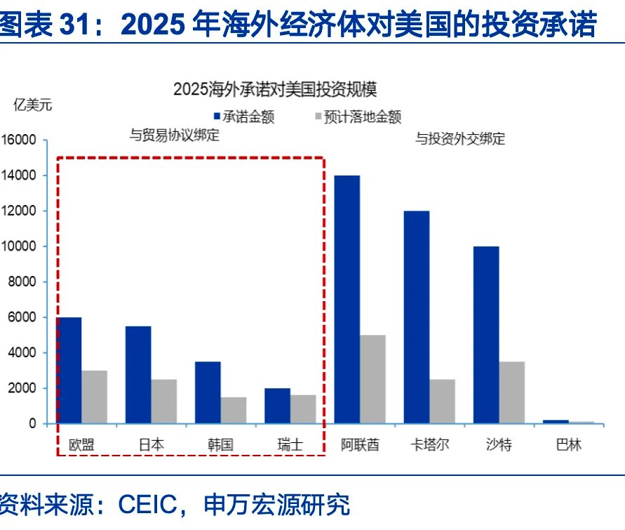 美国的财政支出集中在国防、基建链条,国防支出2027年增速或达50%,再军事化或将提速。2026财年美国国防支出预计增加10.4%至10119亿美元,增速达2008年以来新高;特朗普计划在2027年将国防支出抬高至1.5万亿美元,增速接近50%。边境及移民支出由2025年的648亿增加至2026年的1070亿美元。主因是美丽大法案一次性拨款1910亿美元,分4年使用,平均每年额外增加475亿美元。此外,贸易协议中,欧盟、日本、韩国等对美国投资承诺总额为1.7万亿美元,2026年也可带来投资增量。