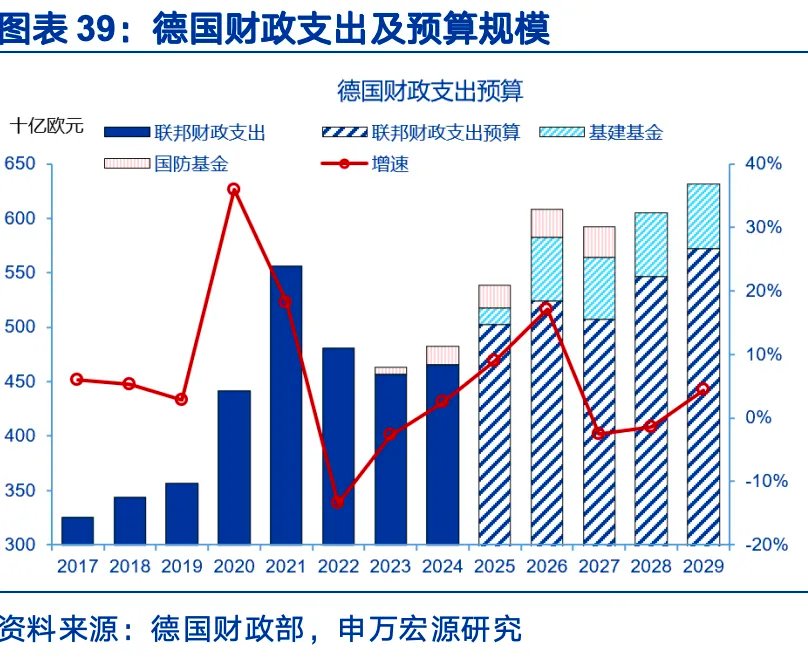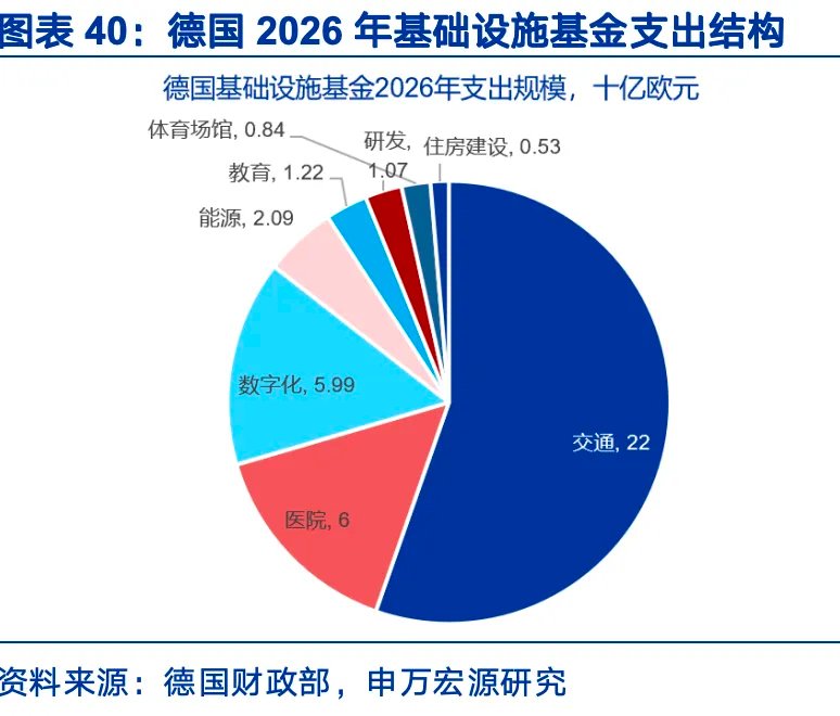 德国是欧洲最主要的财政扩张国,财政扩张集中在基建与国防。德国财政预算包括联邦预算与各类专项基金支出(基础设施基金、气候中和专项基金、国防专项基金)。上述口径下,2026年德国财政预算总额为6338亿欧元,较2025年增长18%,增速为2021年以来新高。主要增量有二:一是国防,2026年支出1082亿欧元(常规827亿+联邦国防特别基金255亿),占GDP达2.8%,较2025年增加217亿欧元,增速达90年代以来新高。德国计划到2029年将年度军事开支增至约1620亿欧元。二是基建投资,2026年德国公共投资规模为1267亿欧元,2023至2025年平均每年为600亿欧元上下。根据基础设施基金规划,2026年主要投向:交通运输占比55%,医院设施占比15%,数字基础设施占比15%、能源设施占比5%。