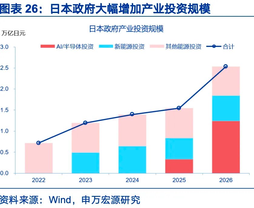 日本财政特征是高债务环境下大幅增加AI等战略产业投资,加速国防投资,需求端继续支持民生与抗通胀。2025年日本政府债务率234%,远高于欧美主要经济体。2025年政府利息支出占GDP比重1.5%,高市上台后,日本政策重心转移,不再强调单年度的基础财政平衡,在高债务环境下继续加大扩张力度。产业投资上,2026年,日本将AI与半导体投资资金划归为常态预算,2026年AI与半导体相关预算升值1.2万亿日元,是去年的4倍。国防层面,日本2026年国防预算9.0万亿日元,增速3.8%,提前一年达成GDP 2%的目标;需求措施上,高市早苗的刺激计划侧重于通胀补贴与民生保障,总额共11.7万亿日元,包括家庭电力、燃气费用补贴、儿童补助、减税等,起到压低通胀效果。