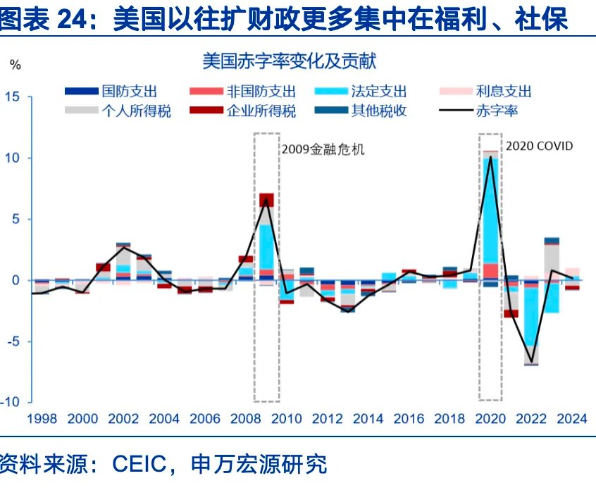 海外财政政策所扮演的角色正在发生变化。财政政策的目标扩围,从需求侧管理,扩大到供给侧重塑与安全。发达经济体货币政策的目标函数仍锚定在通胀或就业上,但在政治、地缘安全等压力下,财政的目标出现了转向与扩围。2020年前,发达经济体财政目标集中在需求侧管理上,通过救济、福利支出等稳定经济,对产业政策、国防的支持度较弱。2025年以来,除了传统的逆周期调节外,美欧日普遍加大了对关键产业、供应链安全、国防安全的支持。财政成为维护地缘及经济安全的“武器”,以国防为代表的可选支出成为必选项,西方国家财政扩张或更加常态化。
