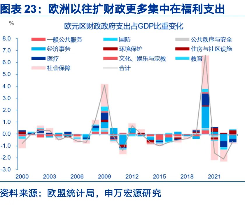 1、全球财政目标转向,财政更加武器化。海外财政政策所扮演的角色正在发生变化。财政政策的目标从需求侧管理,扩大到供给侧重塑与安全。财政的作用从被动平滑周期转变为主动引导周期。财政政策正常化的两大约束力量在减弱,一方面是主动紧财政的动力减弱。另一方面是,债务风险的约束也不足以压缩赤字。