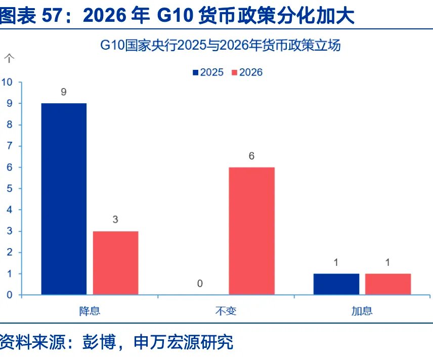 然而,不可照搬以往的经济周期经验看待经济的复苏。第一,周期修复的动力已发生变化,典型的经济复苏或难以重现。典型的全面周期修复需要私人部门参与,始于货币宽松:降息—私人信贷扩张—实体经济需求上升。2026年经济增长的动力来自财政,财政扩张带来的高利率或压制私人部门的扩张,经济改善或更集中在政府直接支持的领域,复苏的全面性存疑。货币端,G10央行中,降息数量或由2025年的9家下降至3家,利率不变的央行数或由2025年的0家增加至6家。日央行继续加息,欧央行停止降息,美联储2026年降息幅度可能低于2024及2025年。
