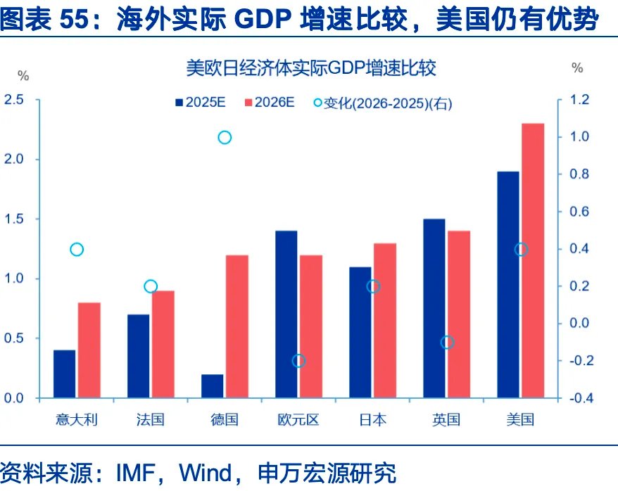 从总量上看,财政扩张为美日德经济增长提供了支撑,增速层面仍有韧性。美国经济有望再加速,日本经济托底,德国从零增长到温和复苏。美国增速预计从2025年的1.9%升至2026年的2.3%,增速高于长期趋势,其中财政贡献0.5-0.6个百分点,起到经济再加速的作用。日本经济增速或从2025年的1.1%回升至2026年的1.3%,日本高债务叠加利率正常化,财政效果表现为托底经济,参考日本内阁估算,财政可贡献0.4-0.5个点的增长。由于成员国政策分化,欧元区2026年增速预计由1.4%小幅降至1.2%。德国因国防与基建,2026年增速或由0.2%抬升至1.0-1.2%。