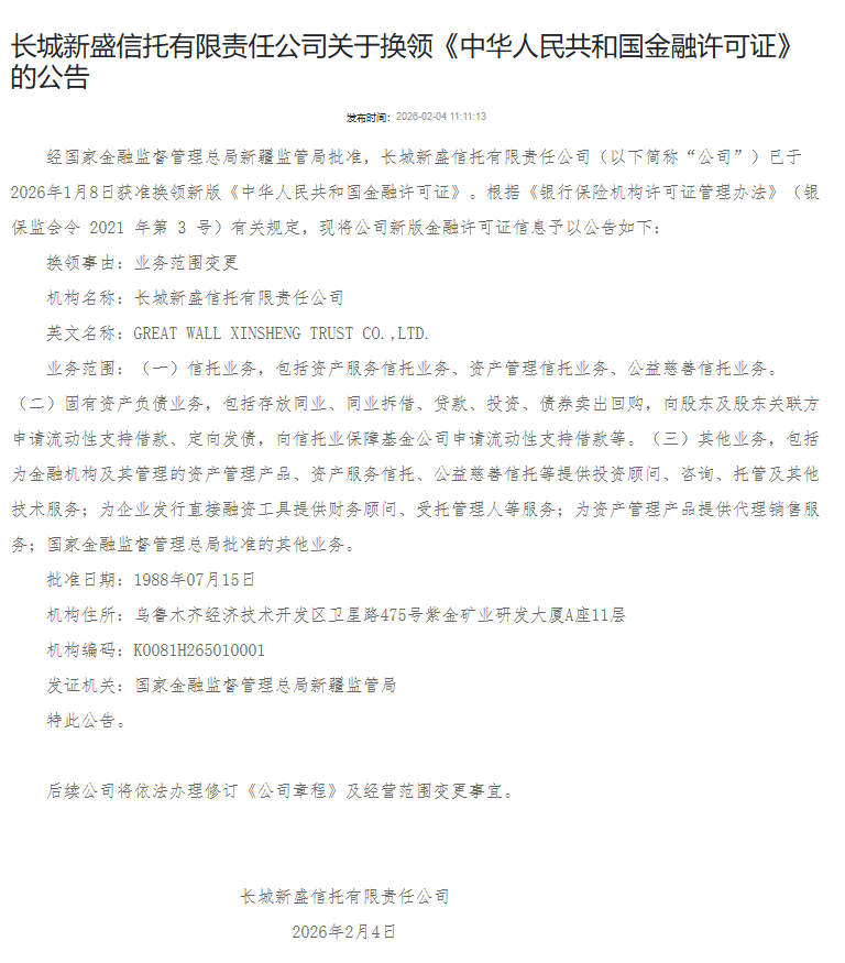 此外,长城新盛信托于2月4日在官网还发布了关于换领《中华人民共和国金融许可证》的公告。公告称,经国家金融监督管理总局新疆监管局批准,长城新盛信托已于2026年1月8日获准换领新版《中华人民共和国金融许可证》。换领事由为业务范围变更。