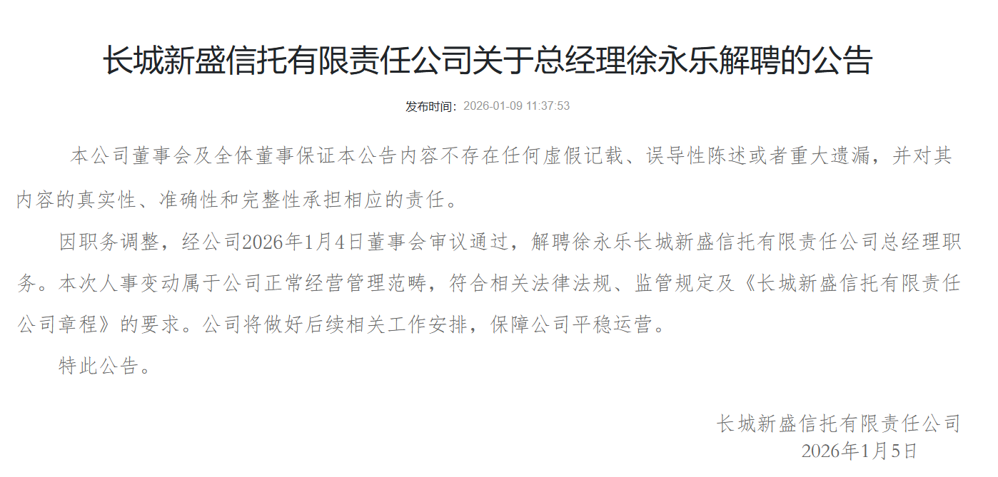日前,长城新盛信托有限责任公司(下称:“长城新盛信托”)在官网公告总经理解聘信息:因职务调整,经该公司2026年1月4日董事会审议通过,解聘徐永乐长城新盛信托总经理职务。