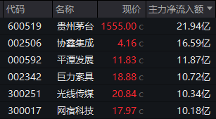 个股方面,贵州茅台获得逾21亿元主力资金净流入,协鑫集成、平潭发展、巨力索具、光线传媒、网宿科技5股也获得超10亿元净流入。
