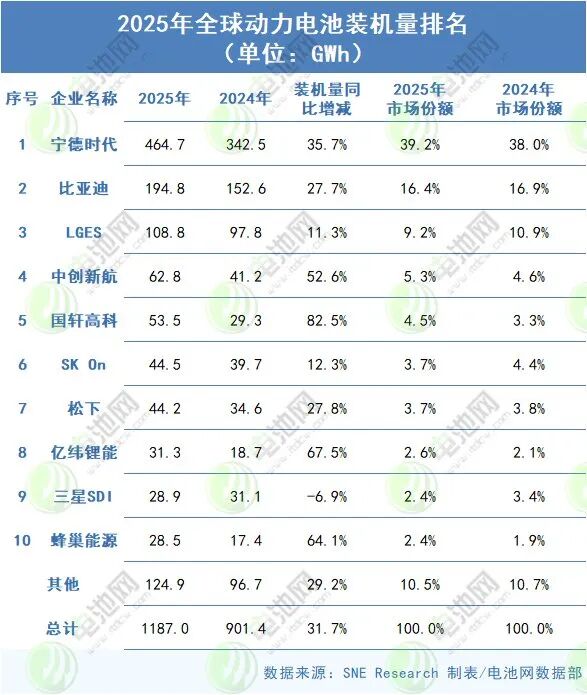 此外,2月4日,SNE Research还公布了2025年全球动力电池装车量最新数据。2025年,全球动力电池装车量达1187GWh,同比增长31.7%。
