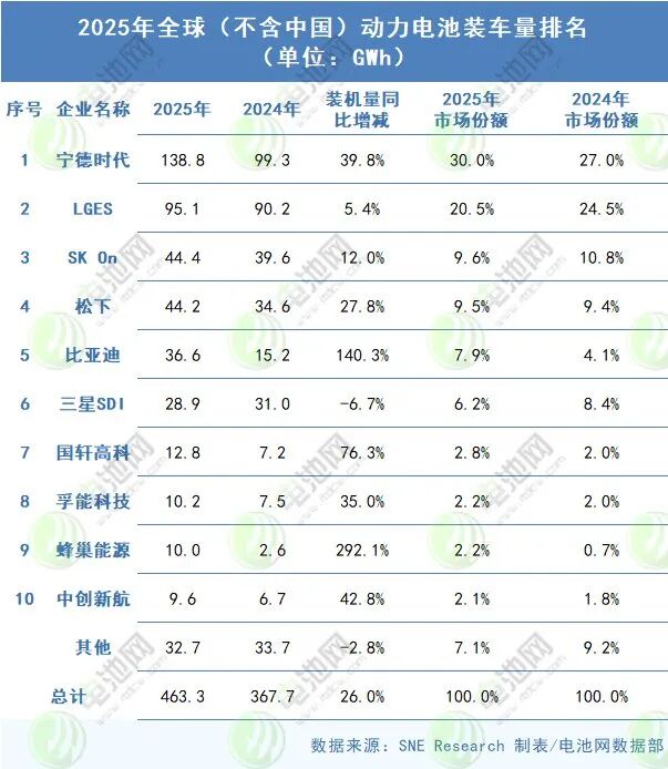 从装车量同比变化来看,2025年全球(不含中国)动力电池装车量TOP10企业中,仅三星SDI装车量同比下滑6.7%,为榜单中唯一负增长企业。此外,比亚迪、蜂巢能源表现亮眼,装车量实现三位数高增长,其中比亚迪同比增长140.3%,蜂巢能源同比增长292.1%,增速领跑榜单。