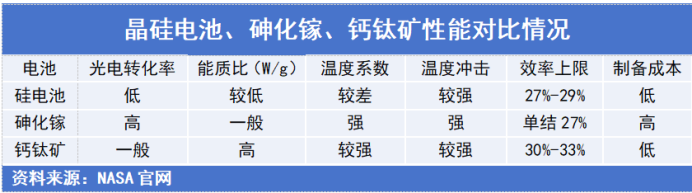 钙钛矿电池为第三代薄膜电池,其最大优势在于效率提升潜力大,电池理论效率可达33%,被视为太空光伏中长期的最优解。