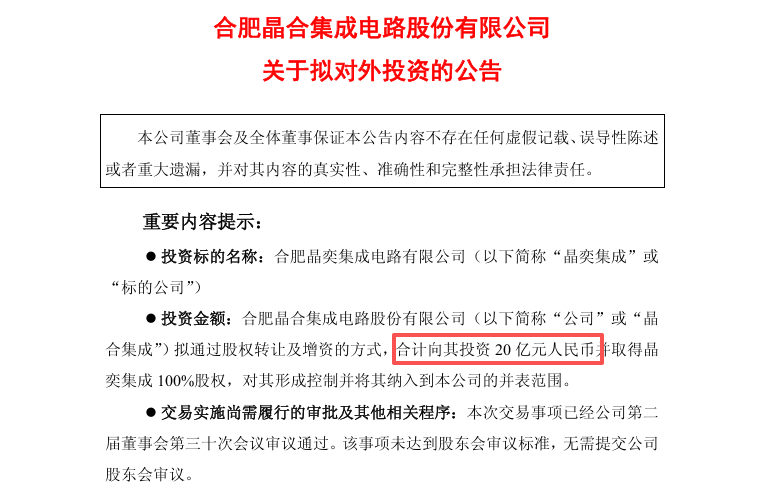 2月6日晚间,晶合集成发布对外投资公告称,公司拟通过股权转让及增资相结合的方式,合计投资 20 亿元取得合肥晶奕集成电路有限公司100% 股权。