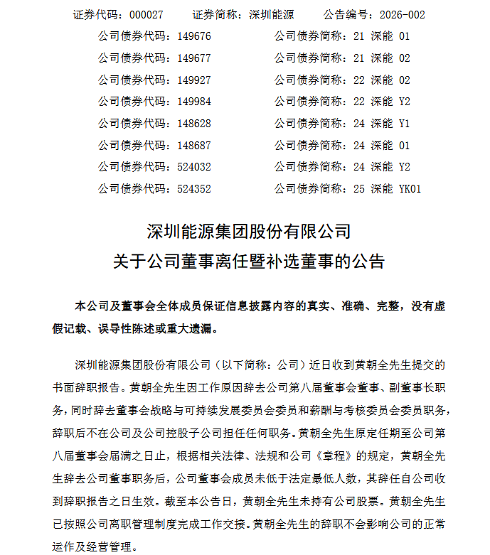 #北极星固废网 获悉,2月5日,深圳能源公告,公司近日收到董事黄朝全的书面辞职报告,黄朝全因工作原因辞去公司董事、副董事长等职务,辞职后不在公司及公司控股子公司担任任何职务,辞任自公司收到辞职报告之日生效。
