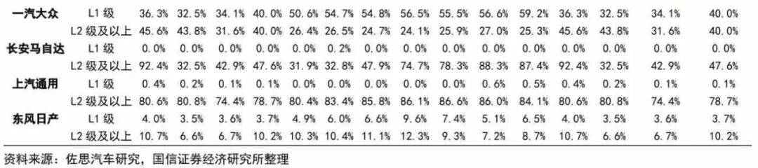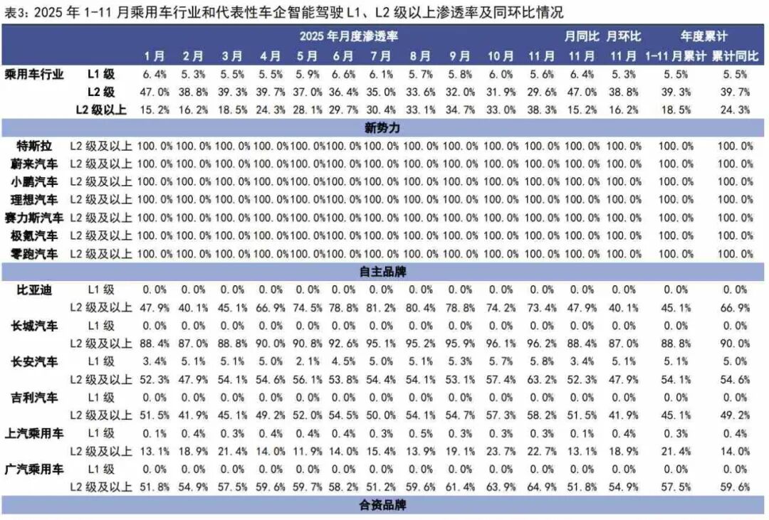 2025年1-11月累计,乘用车标配L2级功能的渗透率为36.1%,同比-6.3pct,乘用车标配L2级以上功能的渗透率为28.1%,同比+13.7pct。新势力品牌L2级及以上渗透率基本在90%以上,头部自主品牌(比亚迪、长城汽车、广汽乘用车等)L2级及以上渗透率在40%以上,领先合资品牌。