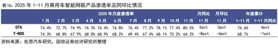 OTA、T-BOX 11月的渗透率分别80.5%、64.2%,同比分别+5、-8pct。