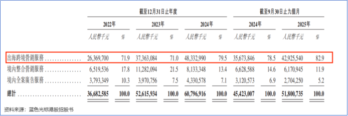 2025年前三季度,公司来自出海跨境营销服务的收入达到429.26亿元,占比达82.9%。