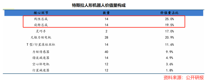 其中,线性执行器价值量占比25%,旋转执行器占比20%,特斯拉人形机器人便搭载了14个线性执行器和14个旋转执行器。