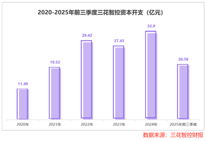 2020年到2025年前三季度,三花智控研发费用累计达58亿元。2020到2024年,三花智控资本开支从11.5亿元大幅增长至32.9亿元。