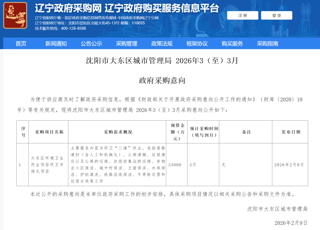 环卫在线网讯,2月9日,沈阳市大东区城市管理局发布了一则重磅采购意向:大东区环境卫生作业项目环卫市场化项目,预算金额高达3.4亿元,预计于2026年3月正式启动采购。这不仅是大东区环卫市场化改革的又一关键节点,更是对过往格局的一次重新审视与挑战。