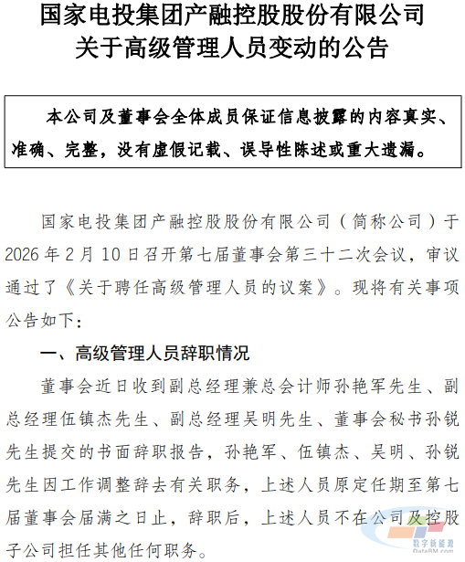 2月11日,电投产融发布高级管理人员变动公告。该公司董事会近日收到副总经理兼总会计师孙艳军、副总经理伍镇杰、副总经理吴明、董事会秘书孙锐提交的书面辞职报告。