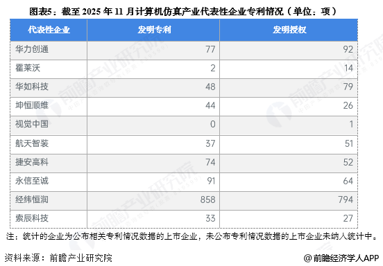 从我国计算机仿真相关上市公司专利情况来看,截至2025年11月,经纬恒润在专利数量方面保持领先,其发明专利与发明授权分别为858项与794项;其次是华力创通,其发明专利与发明授权分别为77项与92项。