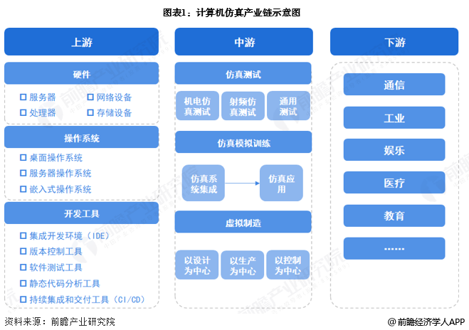 中国计算机仿真产业的上游包括计算机硬件设备、操作系统、开发工具的设计制造;中游包括仿真测试、仿真模拟训练、虚拟制造等领域;下游则主要是通信、工业、医疗、娱乐教育等领域的企业。