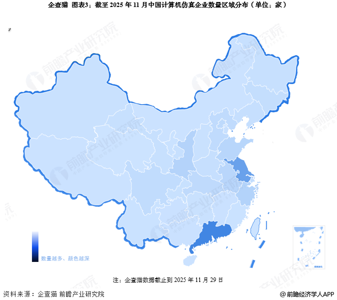 计算机仿真产业链区域热力地图:广东和江苏分布最集中从企查猫以“计算机仿真”为关键词进行精确搜索,得到计算机仿真企业区域分布。从企业地区分布上来看,目前中国计算机仿真企业主要分布在东南沿海地区,特别以广东和江苏为代表。截至2025年11月29日,广东共有相关计算机仿真企业数2000余家,江苏则有近1500家。