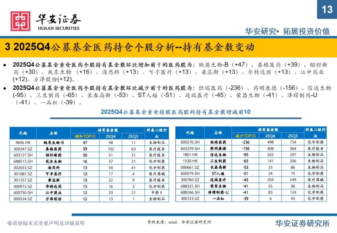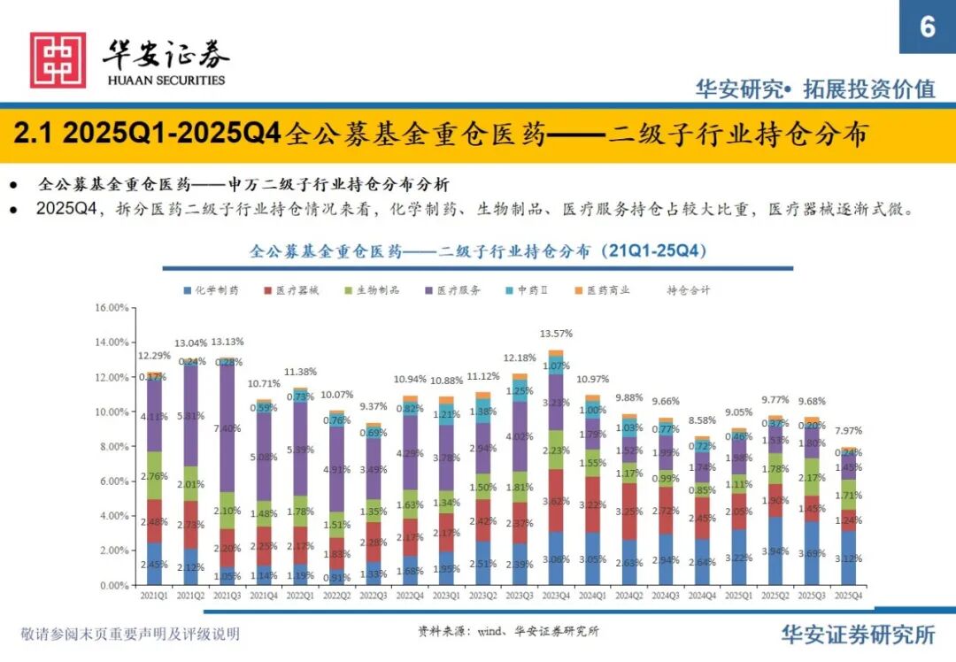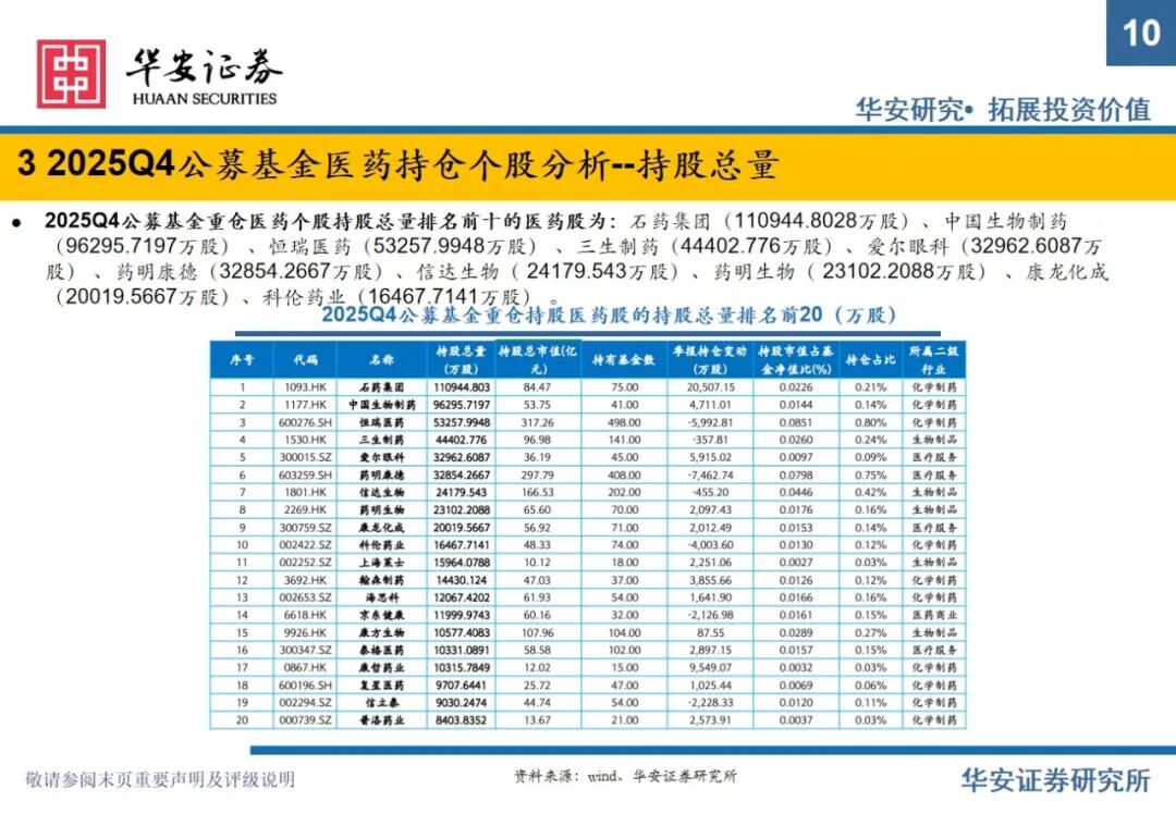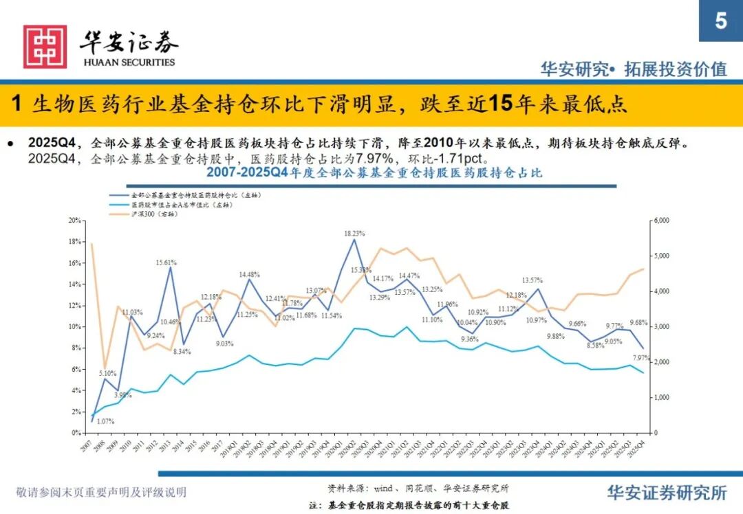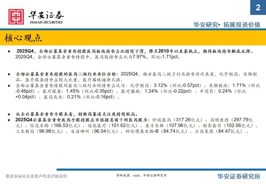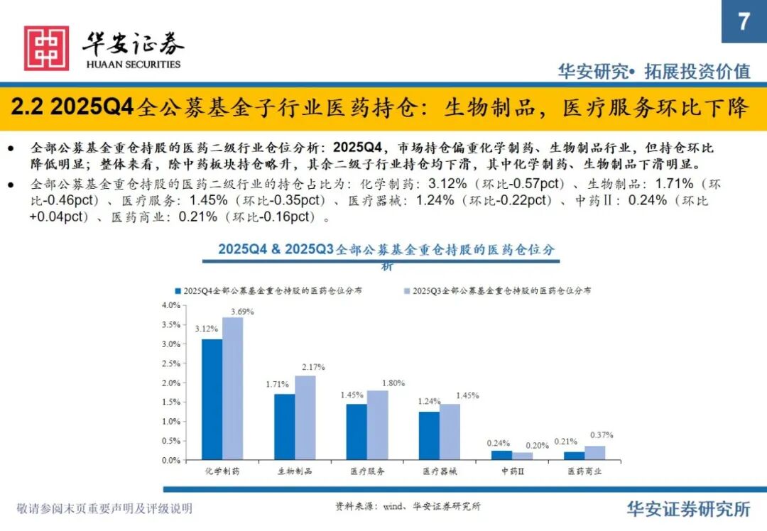 重要提示:本文内容节选自华安证券研究所已发布证券研究报告专题:《全公募基金医药持仓分析:2025Q4医药仓位下滑明显,期待2026年春暖花开》(发布时间:2026年2月11日),具体分析内容请详见报告。若因对报告的摘编等产生歧义,应以报告发布当日的完整内容为准。报告发布机构:华安证券股份有限公司(已获中国证监会许可的证券投资咨询业务资格)。