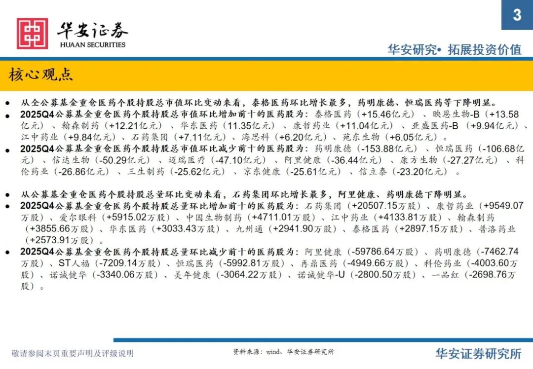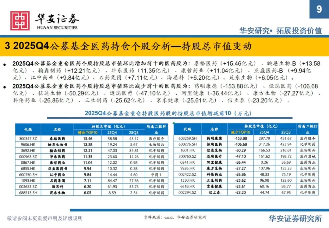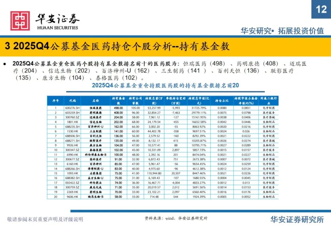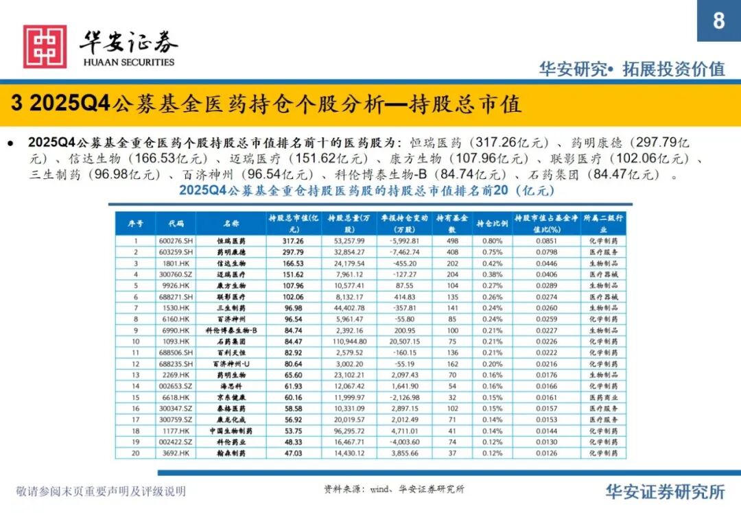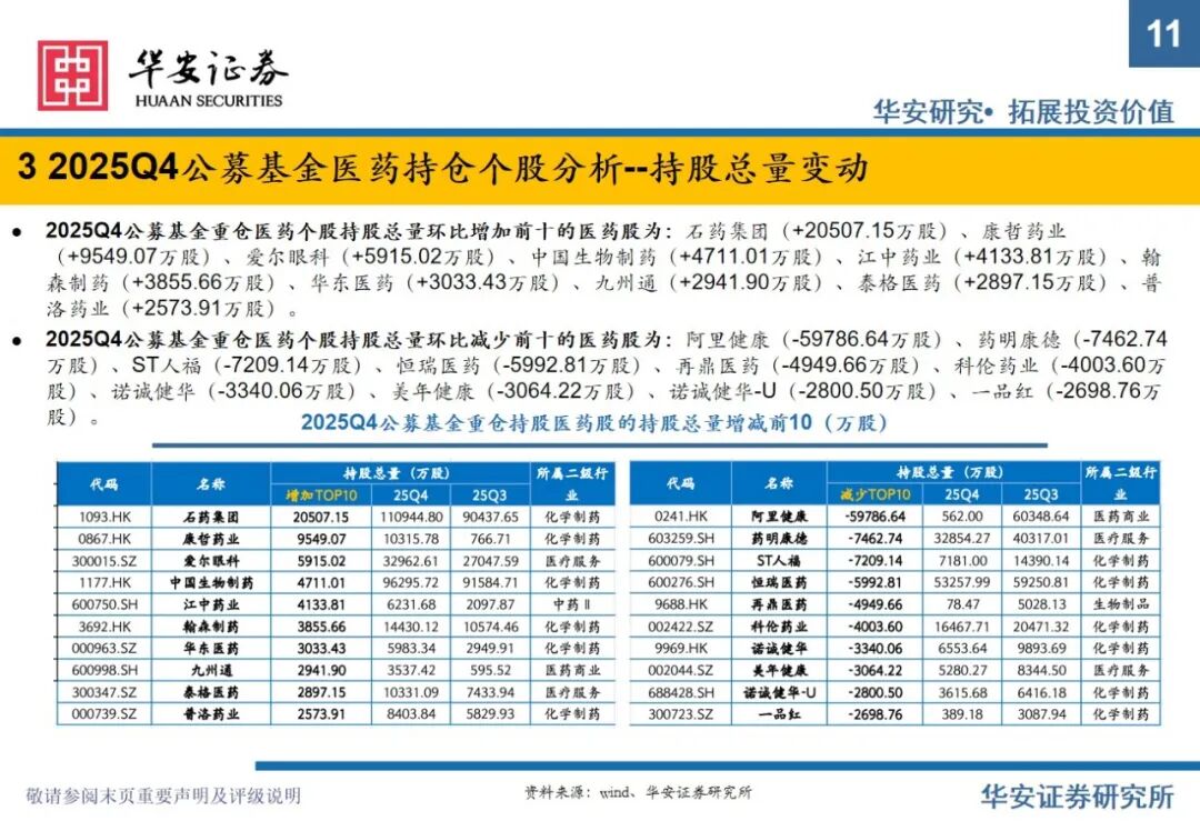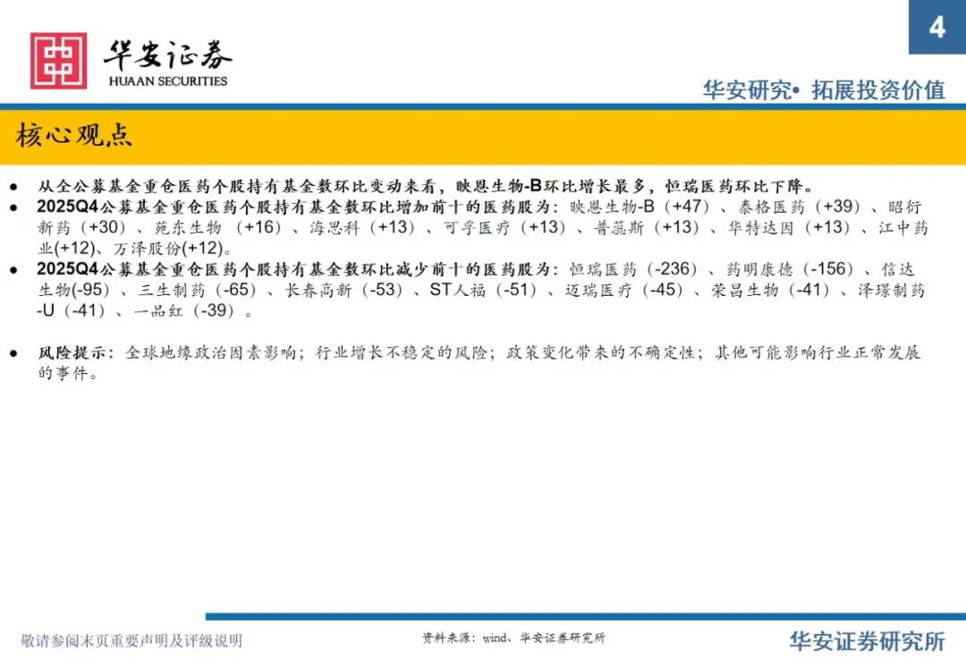 重要提示:本文内容节选自华安证券研究所已发布证券研究报告专题:《全公募基金医药持仓分析:2025Q4医药仓位下滑明显,期待2026年春暖花开》(发布时间:2026年2月11日),具体分析内容请详见报告。若因对报告的摘编等产生歧义,应以报告发布当日的完整内容为准。报告发布机构:华安证券股份有限公司(已获中国证监会许可的证券投资咨询业务资格)。