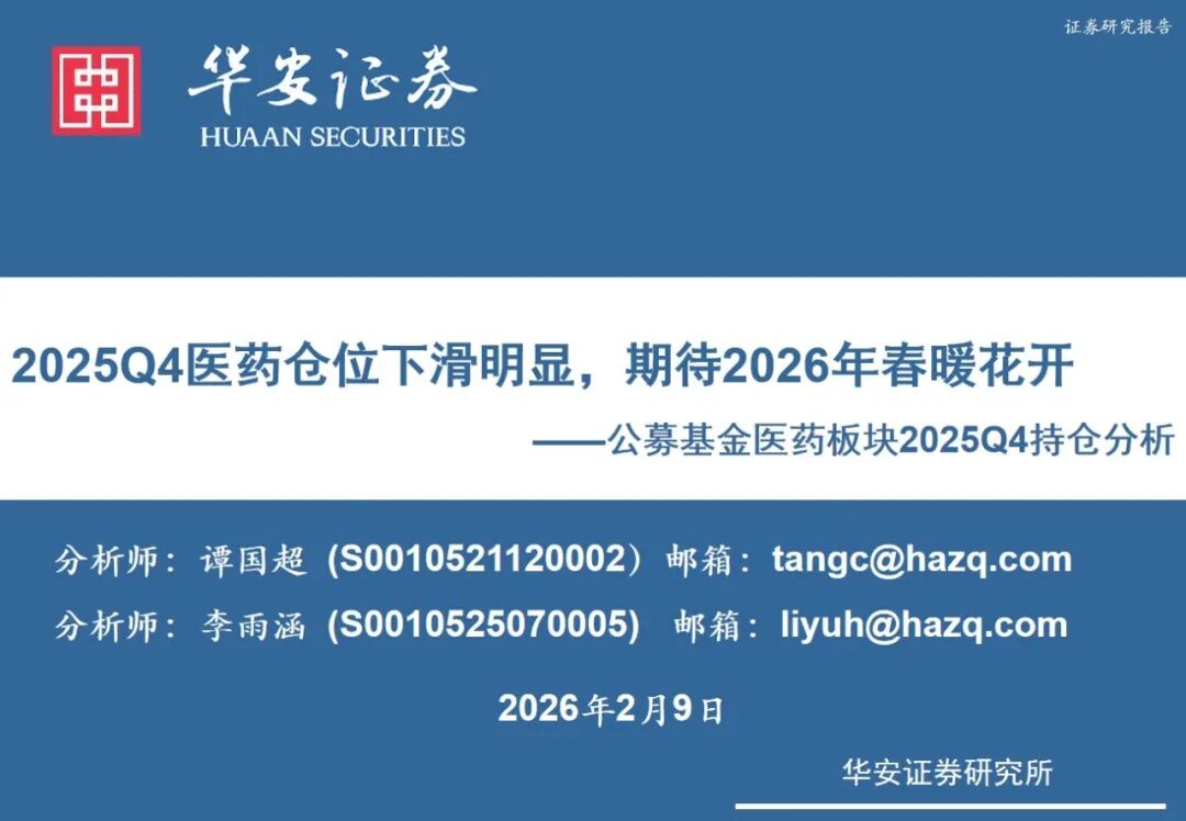 【华安证券医药团队】2026年2月11日发布专题:《全公募基金医药持仓分析:2025Q4医药仓位下滑明显,期待2026年春暖花开》,欢迎与我们交流。