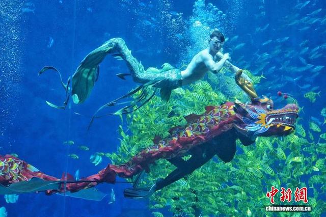 2月15日,长沙湘江海洋王国的潜水员手持新春标语、携龙头潜入水中与鱼群共舞,为游客带来沉浸式新春体验。图为美人鱼演员在水下与龙共舞。中新社记者 杨华峰 摄