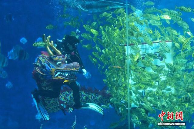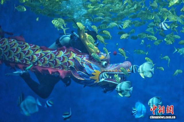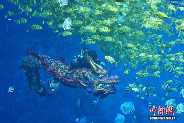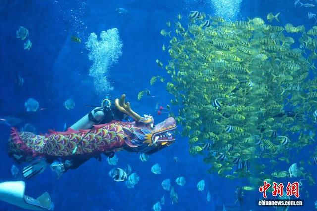 2月15日,长沙湘江海洋王国的潜水员手持新春标语、携龙头潜入水中与鱼群共舞,为游客带来沉浸式新春体验。图为潜水员在水下舞龙。中新社记者 杨华峰 摄