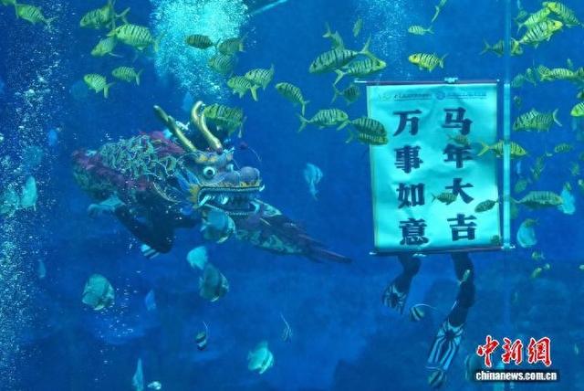 2月15日,长沙湘江海洋王国的潜水员手持新春标语、携龙头潜入水中与鱼群共舞,为游客带来沉浸式新春体验。图为潜水员在水下舞龙,展示新春标语。中新社记者 杨华峰 摄