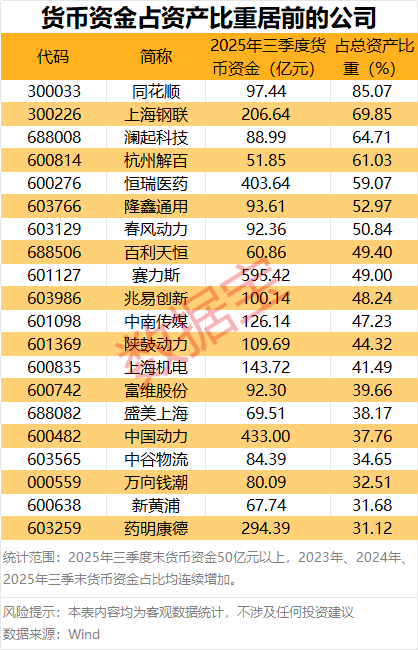 同花顺是货币资金占比最高的公司,2025年三季度末货币资金近百亿元,占总资产比例为85.07%,公司曾在定期报告中表示,在手货币资金迅速变现能力强,能于到期日支付可预见的日常资金需求,流动性风险不大。