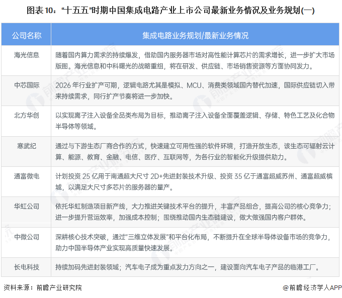 十五五”时期是中国集成电路产业结构深度调整、自主能力全面跃升的关键阶段,在技术、产业链、需求、全球化多重赋能下,将朝着“高端引领、结构均衡、自主可控、全球协同”稳步迈进。该产业各龙头公司也纷纷响应政策,指定对于集成电路业务未来的规划布局。
