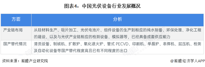 目前,我国光伏设备企业从硅材料生产、硅片加工、光伏电池片、组件设备的生产到相应的纯水制备、环保处理、净化工程的建设以及与光伏产业链相应的检测设备、模拟器等,已经具备成套供应能力。部分产品如清洗设备、制绒机、扩散炉、氧化退火炉、管式PECVD、印刷机、单晶炉、串焊机、层压机、检测及自动化设备等国产替代程度高且已有不同程度的出口。