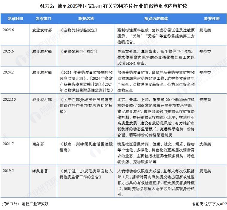 目前,我国暂未出台直接关联宠物芯片行业的国家级政策,宠物芯片行业归属于宠物经济行业。因此,前瞻在本节在对宠物芯片相关政策进行梳理的同时,增加宠物经济行业相关国家政策作为补充。其中,海关总署公告2019年第5号全称为《关于进一步规范携带宠物入境检疫监管工作的公告》,于2019年5月1日起正式施行,提出携带基础限制:入境活动物仅限定犬或猫,且每人每次仅限携带1只。携带时需向海关提交输出国家或地区官方出具的有效检疫证书、狂犬病疫苗接种证书,同时宠物必须植入电子芯片以实现身份识别。截至2025年12月,我国宠物芯片行业相关政策汇总如下: