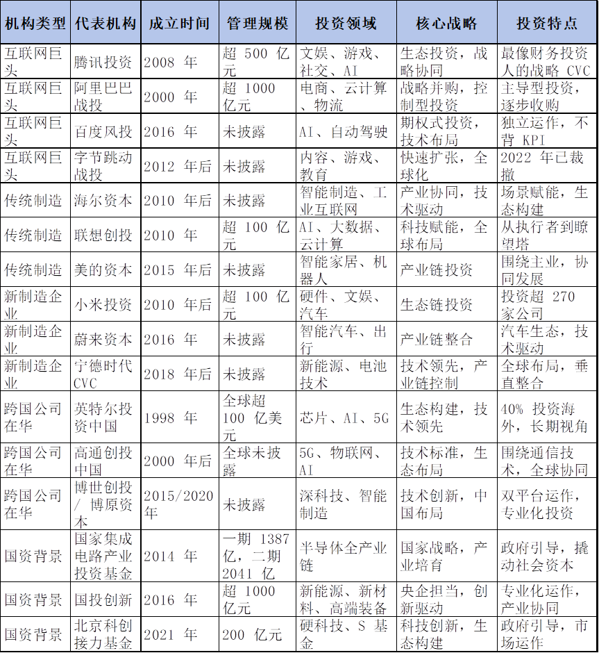 为了更直观地展示国内代表性 CVC 机构的战略特点,以下通过一览表形式进行对比分析: