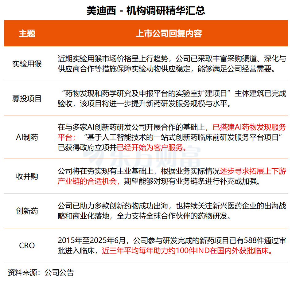 美迪西近日接受中泰证券、天弘基金等23家机构调研。公司在调研中透露,目前,公司在与多家AI创新药研发公司开展合作的基础上,已搭建AI药物发现服务平台,充分整合外部技术资源和内部研发能力,实现双向赋能。同时,公司的“基于人工智能技术的一站式创新药临床前研发服务平台项目”已获得政府立项,并已经开始为客户服务。