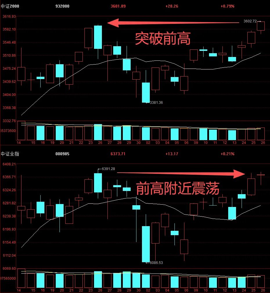 拆分指数,代表市场整体的全指在前高附近,代表小盘的中证2000创新高,震荡只是在继续凝聚力量