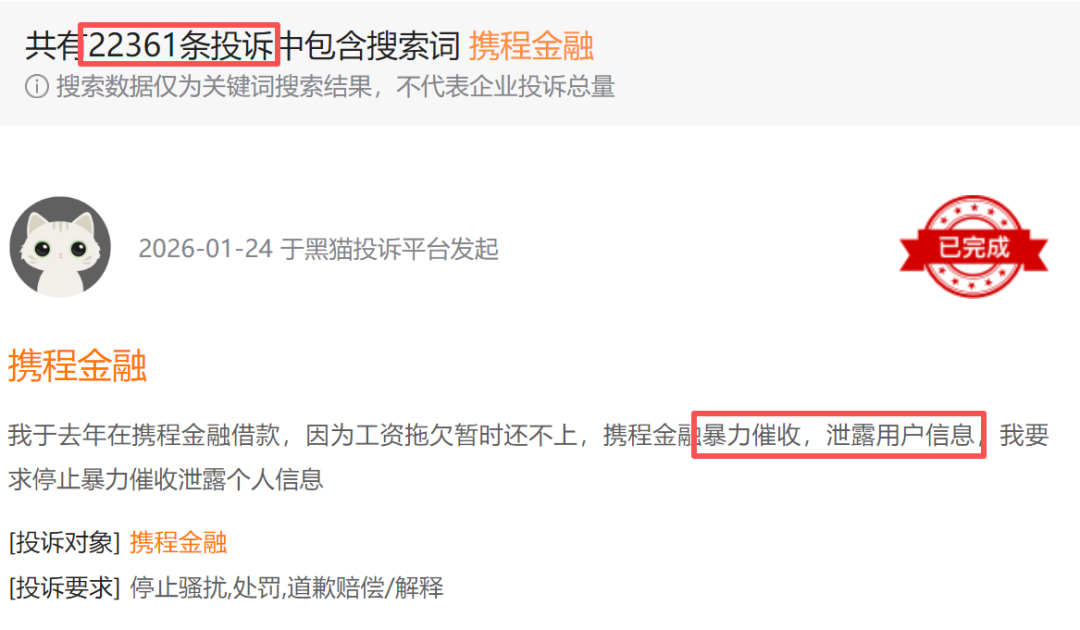 但高速发展的携程金融业务也带来一系列问题。黑猫投诉【下载黑猫投诉客户端】平台数据显示,携程金融累计投诉量已经超过22000条,主要投诉内容为暴力催收、信息泄露(曝光通讯录)、借贷利率高(套路贷)、乱扣费等方面。