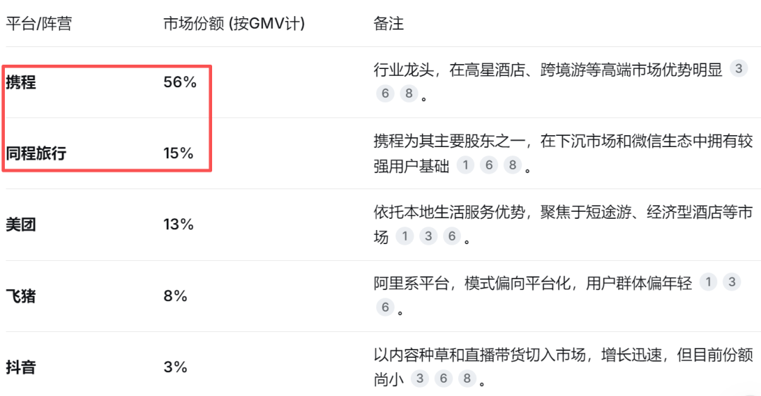 根据交银国际等机构的数据,以总交易额(GMV)计算,携程在2024年的市场份额约为56%,若将其投资的同程旅行等平台合并计算为“携程系”,其整体份额则达到70%,一家独大的市场支配地位明显。