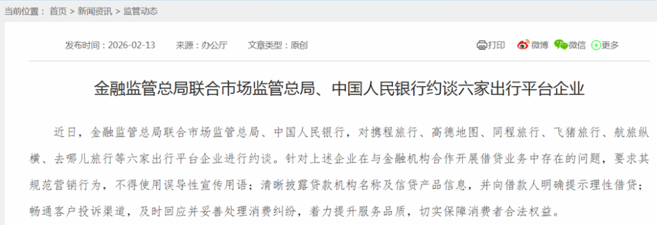 2025年4月,国家计算机病毒应急处理中心就曾通报,携程金融APP存在“未经同意向第三方传输敏感信息”“处理敏感信息未遵循最小必要原则”等两项违规行为。而在今年春节前夕(2月13日),国家金融监督管理总局联合市场监管总局、中国人民银行,对携程旅行等平台与金融机构开展借贷业务存在的问题进行约谈。