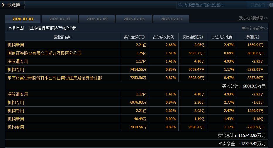 湖南白银(002716)今日涨10.01%,成交额83.11亿元,换手率21.53%,盘后龙虎榜数据显示,深股通专用席位买入1.17亿元并卖出4.10亿元,1家机构专用席位净买入1569.91万元,有3家机构专用席位净卖出3.02亿元。