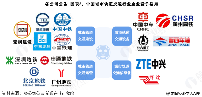 中国城市轨道交通行业主要包括城市轨道交通建设、城市轨道交通设备、城市轨道交通运营以及城市轨道交通信息化几个细分市场。其中,城市轨道交通建设行业代表企业包括中国中铁、中国铁建等,其中中国中铁、中国铁建是我国城市轨道交通建设的主力;中国城市轨道设备参与者主要为中国中车及其子公司,市场占比高达90%以上;城市轨道交通运营企业地域性较强,代表企业包括上海的申通地铁、北京地铁、深圳地铁、广州地铁等;中国城市轨道交通信息化行业包括中兴、辉煌科技等。